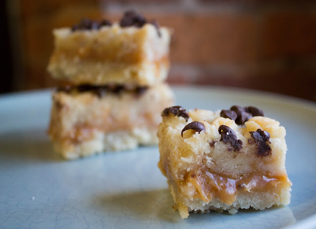Remove the remaining chilled dough from the refrigerator and crumble it evenly over the caramel. Return the pan to the oven and bake until the filling is bubbly and the crumbled shortbread topping is firm and lightly golden, about 30 minutes. Sprinkle chocolate chips on top. Let cool before cutting into squares.